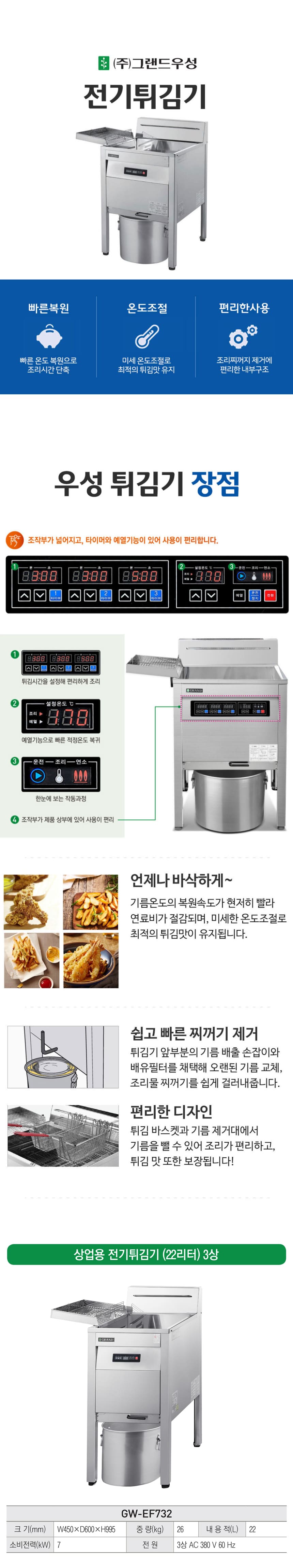 GW-EF732 유버스 [그랜드우성] 업소용 전기 튀김기 22L 3상 제품분류 업소용 AS기간 1년 최저 렌탈가 월 65,700 (렌탈가) 제휴카드 할인가 월 (렌탈가) 3년 4년 5년 할인 제휴카드 보기 렌탈신청 장바구니