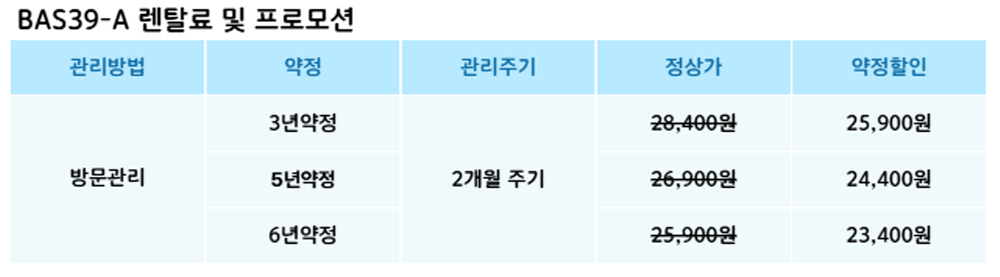 BAS39-A 코웨이 [코웨이] 스스로케어 비데 제품분류 비데 AS기간 렌탈기간내 최저 렌탈가 월 23,400 (렌탈가) 제휴카드 할인가 월 (렌탈가) 3년 5년 6년 방문관리/2개월 할인 제휴카드 보기 렌탈신청 장바구니