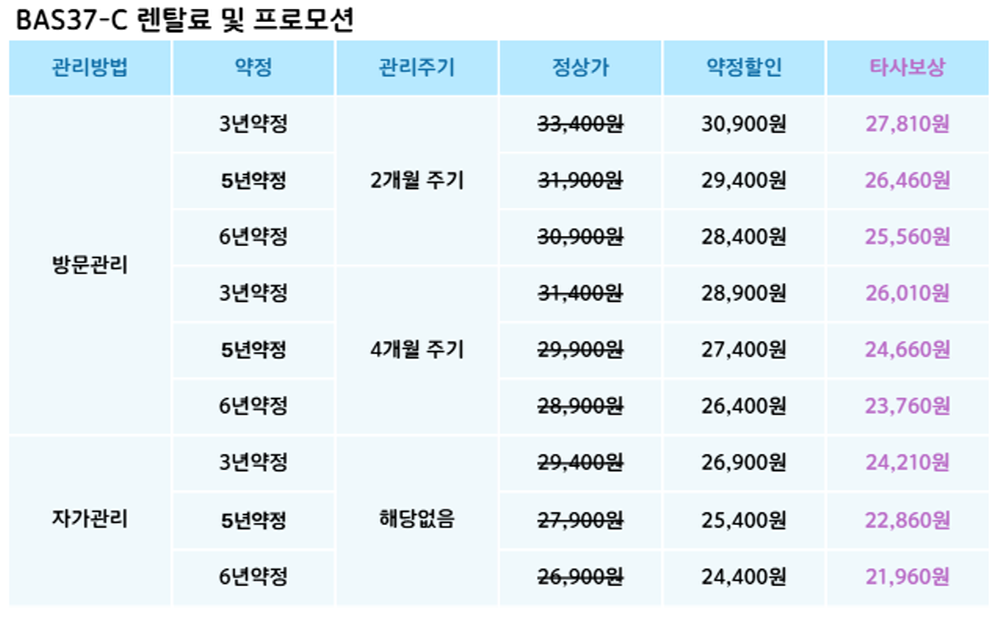 BAS37-C 코웨이 [코웨이] 더블케어 비데2 제품분류 비데 AS기간 렌탈기간내 최저 렌탈가 월 24,400 (렌탈가) 제휴카드 할인가 월 (렌탈가) 3년 5년 6년 자가관리 방문관리/4개월 할인 제휴카드 보기 렌탈신청 장바구니