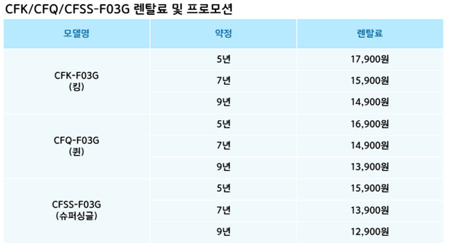 CFSS-F03G,CFQ-F03G,CFK-F03G 코웨이 [코웨이] 파운데이션 그레이 (슈퍼싱글,퀸,킹) 제품분류 침대 AS기간 렌탈기간내 최저 렌탈가 월 12,900 (렌탈가) 제휴카드 할인가 월 (렌탈가) 5년 7년 9년 슈퍼싱글 퀸 킹 할인 제휴카드 보기 렌탈신청 장바구니