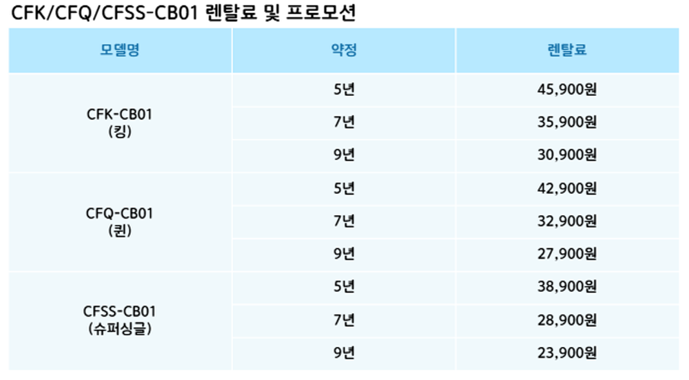 CFK-CB01,CFQ-CB01,CFSS-CB01 코웨이 [코웨이] 컴포트 프레임 제품분류 침대 AS기간 렌탈기간내 최저 렌탈가 월 23,900 (렌탈가) 제휴카드 할인가 월 (렌탈가) 5년 7년 9년 슈퍼싱글 퀸 킹 크림아이보리 멜란지그레이 테라코타오렌지 할인 제휴카드 보기 렌탈신청 장바구니
