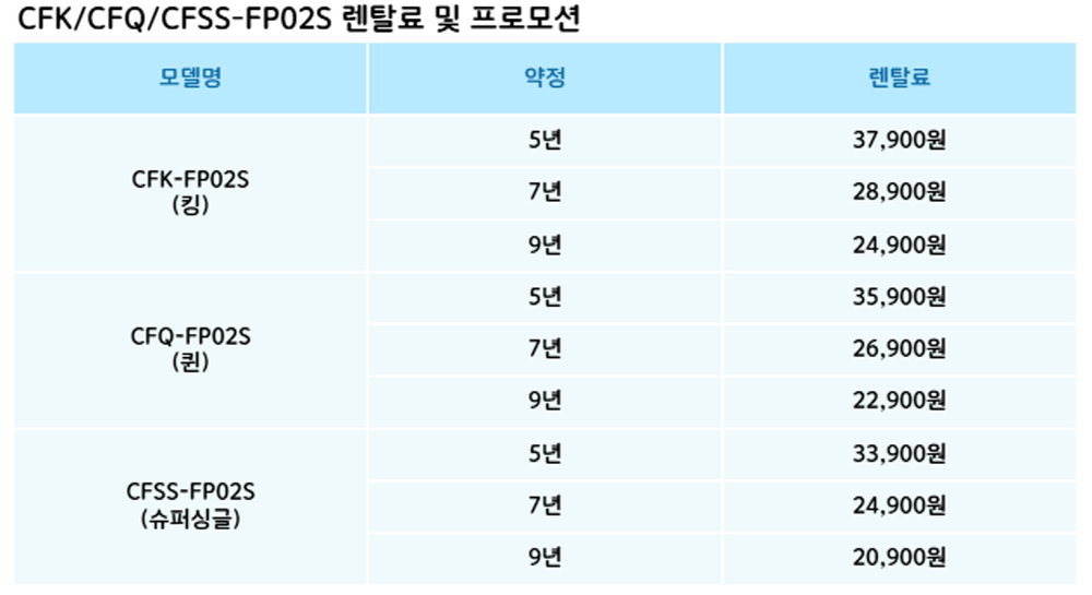 CFSS-FP02S,CFQ-FP02S,CFK-FP02S 코웨이 [코웨이] 마이프레임 볼륨헤드 사이드형(슈퍼싱글,퀸,킹) 제품분류 침대 AS기간 렌탈기간내 최저 렌탈가 월 20,900 (렌탈가) 제휴카드 할인가 월 (렌탈가) 5년 7년 9년 슈퍼싱글 퀸 킹 제품색상 선택 민트그린 + 0원 오트밀베이지 + 0원 크림아이보리 + 0원 차콜그레이 + 0원 모카브라운 + 0원 할인 제휴카드 보기 렌탈신청 장바구니