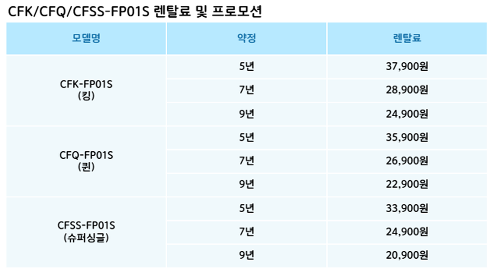 CFSS-FP01S,CFQ-FP01S,CFK-FP01S 코웨이 [코웨이] 마이프레임 플랫헤드 사이드형(슈퍼싱글,퀸,킹) 제품분류 침대 AS기간 렌탈기간내 최저 렌탈가 월 20,900 (렌탈가) 제휴카드 할인가 월 (렌탈가) 5년 7년 9년 슈퍼싱글 퀸 킹 제품색상 선택 오트밀베이지 + 0원 차콜그레이 + 0원 크림아이보리 + 0원 민트그린 + 0원 모카브라운 + 0원 할인 제휴카드 보기 렌탈신청 장바구니