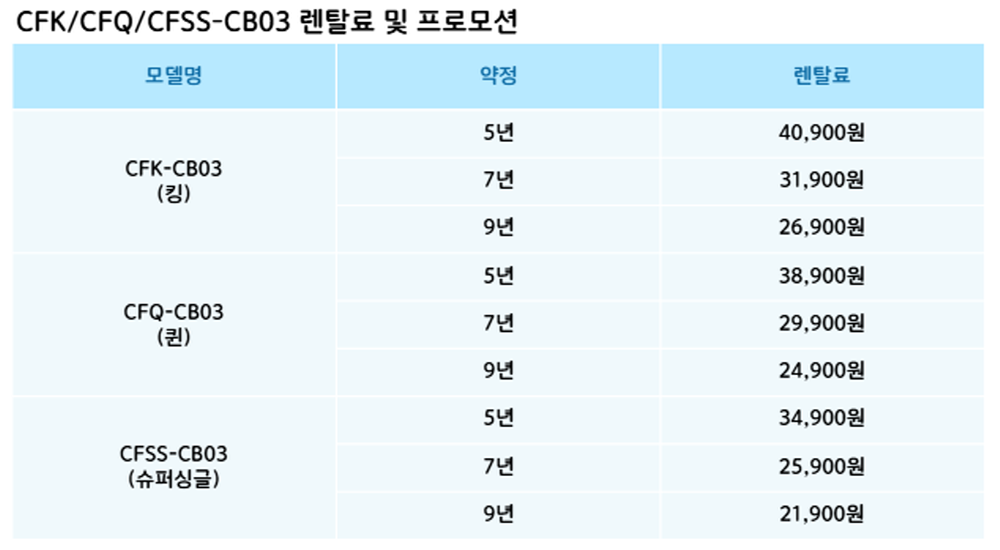 CFK-CB03,CFQ-CB03,CFSS-CB03 코웨이 [코웨이] 소프트 쿠션 프레임 제품분류 침대 AS기간 렌탈기간내 최저 렌탈가 월 21,900 (렌탈가) 제휴카드 할인가 월 (렌탈가) 5년 7년 9년 슈퍼싱글 퀸 킹 제품색상 선택 코튼아이보리 + 0원 스톤그레이 + 0원 로즈핑크 + 0원 할인 제휴카드 보기 렌탈신청 장바구니