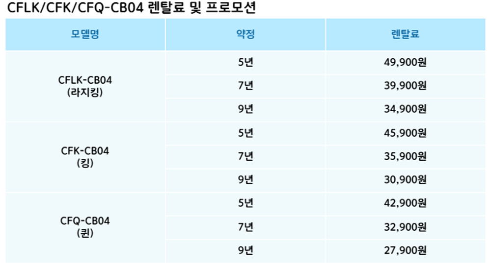 CFK-CB04,CFQ-CB04,CFLK-CB04 코웨이 [코웨이] 그레이스 프레임 제품분류 침대 AS기간 렌탈기간내 최저 렌탈가 월 27,900 (렌탈가) 제휴카드 할인가 월 (렌탈가) 5년 7년 9년 퀸 킹 라지킹 제품색상 선택 헤링본그레이 + 0원 헤링본블랙 + 0원 글렌체크그레이 + 0원 할인 제휴카드 보기 렌탈신청 장바구니