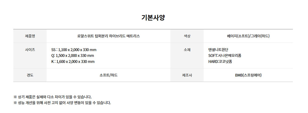 로얄스위트 탑퍼분리 하이브리드 매트리스 청호나이스 [청호나이스] 로얄스위트 탑퍼분리 하이브리드 매트리스 SS/Q/K 제품분류 매트리스 AS기간 렌탈기간내 최저 렌탈가 월 29,900 (렌탈가) 제휴카드 할인가 월 (렌탈가) 5년 6년 슈퍼싱글 퀸 킹 방문관리/4개월 자가관리 제품색상(경도) 선택 베이지(소프트) + 0원 그레이(하드) + 0원 할인 제휴카드 보기 렌탈신청 장바구니