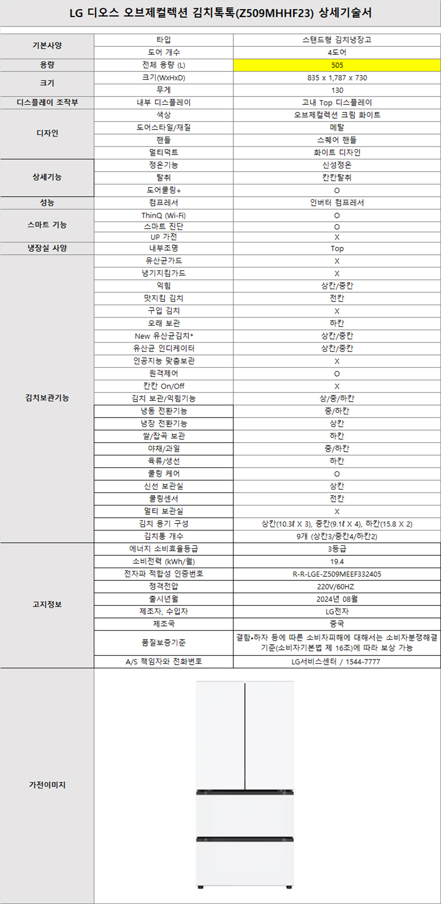 Z509MHHF23 더리본 [LG] 오브제컬렉션 김치톡톡 4도어 김치냉장고 505L 오브제컬렉션 크림 화이트 제품분류 주방가전 용량(총량) 505L 기능 4도어 구좌 3구좌 AS기간 1년 A/S기간 사업장6개월 최저 렌탈가 월 105,000 (렌탈가) 제휴카드 할인가 월 (렌탈가) 1-60회 61-188회 할인 제휴카드 보기 렌탈신청 장바구니
