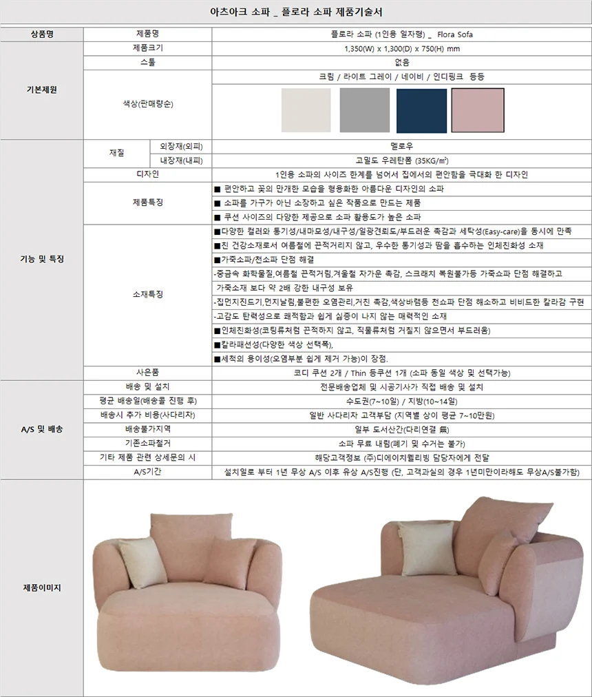 플로라 소노아임레디 [아츠아크] 플로라 일자형 1인용 소파 제품분류 가구/침대 구좌 4구좌 AS기간 1년 최저 렌탈가 월 66,000 (렌탈가) 제휴카드 할인가 월 (렌탈가) 1-200회 할인 제휴카드 보기 렌탈신청 장바구니