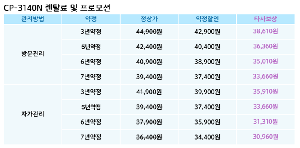 CP-3140N 코웨이 [코웨이] 노블 정수기 빌트인 (냉정) 제품분류 정수기 정수방식 직수형 기능 냉수전용 AS기간 렌탈기간내 이벤트 3개월면제 최저 렌탈가 월 34,400 (렌탈가) 제휴카드 할인가 월 (렌탈가) 3년 5년 6년 7년 자가관리 방문관리/6개월 제품색상 선택 화이트 + 0원 실버 + 0원 베이지 + 0원 브라운 + 0원 네이비 + 0원 그레이 + 0원 할인 제휴카드 보기 렌탈신청 장바구니