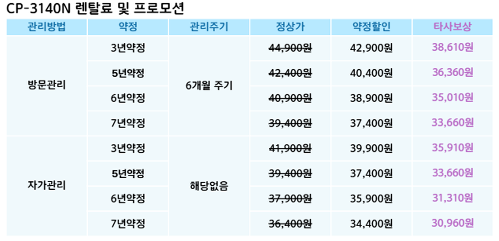 CP-3140N 코웨이 [코웨이] 노블 정수기 빌트인 (냉정) 제품분류 정수기 정수방식 직수형 기능 냉수전용 AS기간 렌탈기간내 이벤트 3개월면제 최저 렌탈가 월 30,960 (렌탈가) 제휴카드 할인가 월 (렌탈가) 3년 5년 6년 7년 자가관리(타사보상) 자가관리 방문관리/6개월(타사보상) 방문관리/6개월 제품색상 선택 화이트 + 0원 실버 + 0원 베이지 + 0원 브라운 + 0원 네이비 + 0원 그레이 + 0원 할인 제휴카드 보기 렌탈신청 장바구니