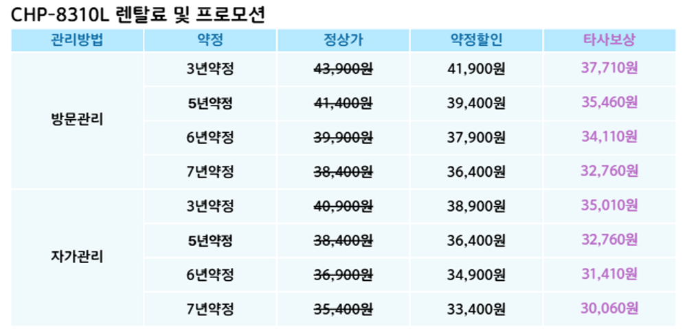CHP-8310L 코웨이 [코웨이] 노블 정수기 RO (냉온정) 제품분류 정수기 정수방식 탱크형 기능 냉온전용 AS기간 렌탈기간내 이벤트 3개월면제 최저 렌탈가 월 33,400 (렌탈가) 제휴카드 할인가 월 (렌탈가) 3년 5년 6년 7년 자가관리 방문관리/6개월 제품색상 선택 포슬린 화이트 + 0원 플래티넘 실버 + 0원 브론즈 베이지 + 0원 마호가니 브라운 + 0원 미드나잇 네이비 + 0원 페블 그레이 + 0원 할인 제휴카드 보기 렌탈신청 장바구니