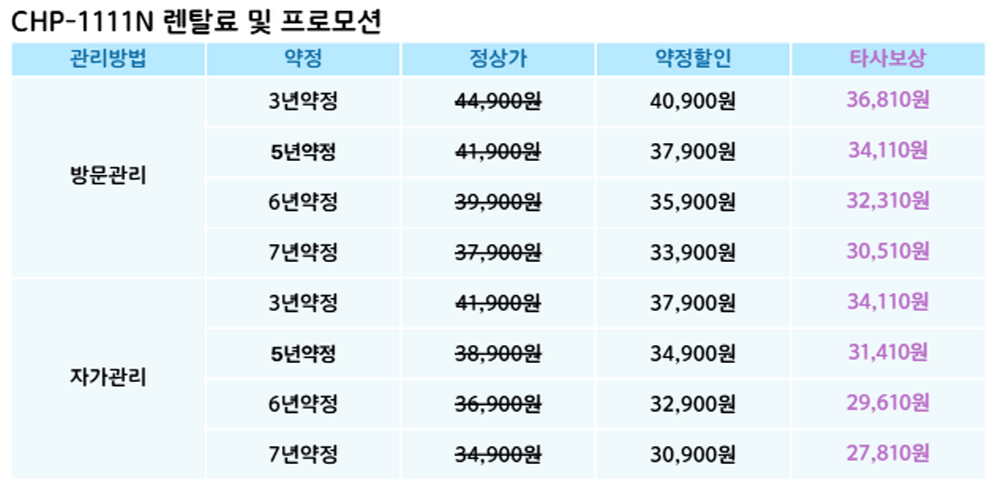 CHP-1111N 코웨이 [코웨이] 엘리트 빌트인 정수기 제품분류 정수기 정수방식 직수형 기능 냉온전용 AS기간 렌탈기간내 최저 렌탈가 월 30,900 (렌탈가) 제휴카드 할인가 월 (렌탈가) 3년 5년 6년 7년 자가관리 방문관리/6개월 제품색상 선택 아이언실버 + 0원 아이시블루 + 0원 페블그레이 + 0원 쿼츠브라운 + 0원 할인 제휴카드 보기 렌탈신청 장바구니
