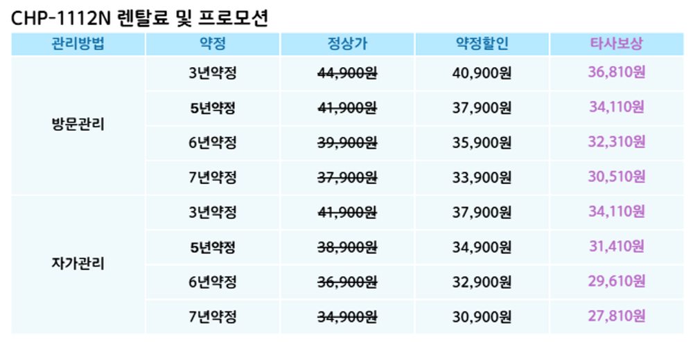 CHP-1112N 코웨이 [코웨이] 엘리트 빌트인 정수기 제품분류 정수기 정수방식 직수형 기능 냉온전용 AS기간 렌탈기간내 최저 렌탈가 월 30,900 (렌탈가) 제휴카드 할인가 월 (렌탈가) 3년 5년 6년 7년 자가관리 방문관리/6개월 제품색상 선택 아이언실버 + 0원 아이시블루 + 0원 페블그레이 + 0원 쿼츠브라운 + 0원 할인 제휴카드 보기 렌탈신청 장바구니