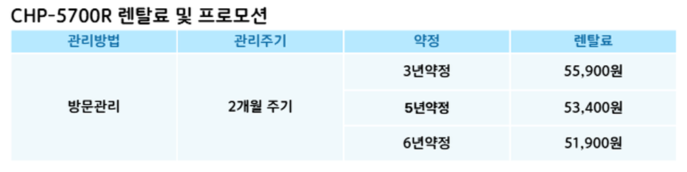 CHP-5700R 코웨이 [코웨이] 시루직수 워터 스탠드(냉온정) 제품분류 정수기 정수방식 탱크형 기능 냉온전용 AS기간 렌탈기간내 최저 렌탈가 월 51,900 (렌탈가) 제휴카드 할인가 월 (렌탈가) 3년 5년 6년 방문관리/2개월 제품색상 선택 화이트 + 0원 할인 제휴카드 보기 렌탈신청 장바구니