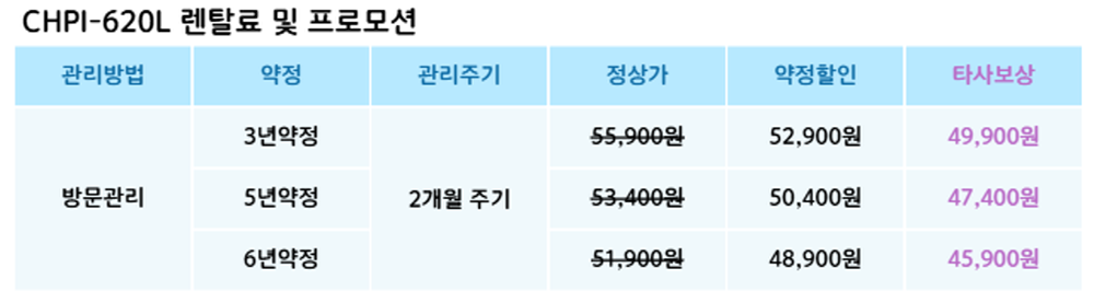 CHPI-620L 코웨이 [코웨이] 아이스 스탠드 슬림 제품분류 정수기 정수방식 탱크형 기능 얼음냉온 AS기간 렌탈기간내 최저 렌탈가 월 48,900 (렌탈가) 제휴카드 할인가 월 (렌탈가) 3년 5년 6년 방문관리/2개월 제품색상 선택 블랙 + 0원 화이트 + 0원 할인 제휴카드 보기 렌탈신청 장바구니