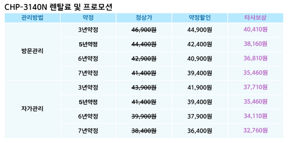 CHP-3140N 코웨이 [코웨이] 노블 정수기 빌트인 (냉온정) 제품분류 정수기 정수방식 직수형 기능 냉온전용 AS기간 렌탈기간내 이벤트 3개월면제 최저 렌탈가 월 36,400 (렌탈가) 제휴카드 할인가 월 (렌탈가) 3년 5년 6년 7년 자가관리 방문관리/6개월 제품색상 선택 화이트 + 0원 실버 + 0원 베이지 + 0원 브라운 + 0원 네이비 + 0원 그레이 + 0원 할인 제휴카드 보기 렌탈신청 장바구니