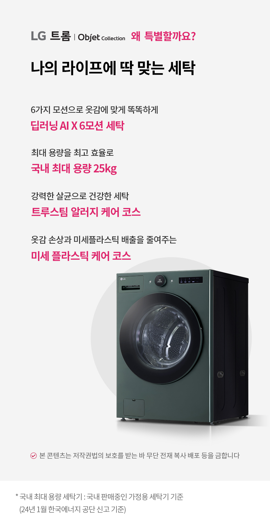 FX25GSGR LG전자구독 [LG] 트롬 오브제컬렉션 세탁기 25kg 네이처그린 제품분류 세탁기 용량(총량) 25KG AS기간 3년 최저 렌탈가 월 41,900 (렌탈가) 제휴카드 할인가 월 (렌탈가) 3년 4년 5년 6년 방문관리/6개월 방문관리/12개월 방문관리/24개월 할인 제휴카드 보기 렌탈신청 장바구니