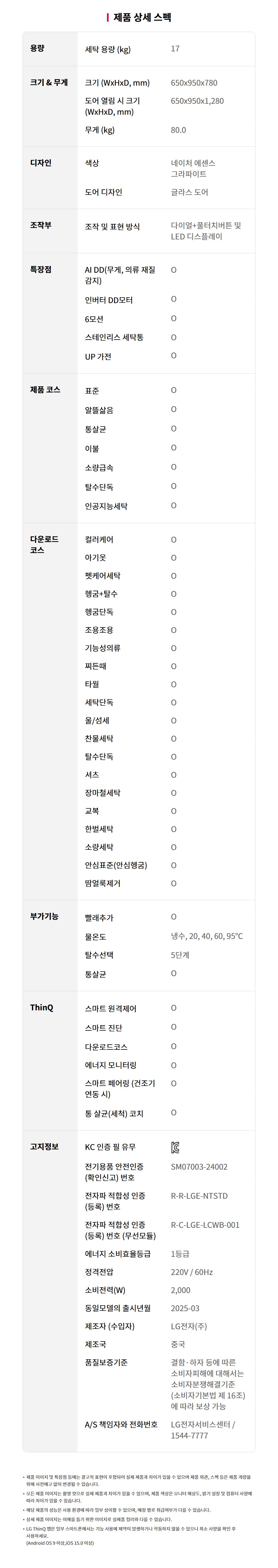 F17HTP LG전자구독 [LG] 트롬 세탁기 17kg 네이처에센스그라파이트 제품분류 세탁기 용량(총량) 17KG AS기간 렌탈기간내 최저 렌탈가 월 26,900 (렌탈가) 제휴카드 할인가 월 (렌탈가) 3년 4년 5년 6년 방문관리/6개월 방문관리/12개월 방문관리/24개월 할인 제휴카드 보기 렌탈신청 장바구니