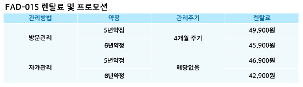 FAD-01S 코웨이 [코웨이] 사계절 의류청정기 더블케어 제품분류 스타일러 AS기간 렌탈기간내 최저 렌탈가 월 42,900 (렌탈가) 제휴카드 할인가 월 (렌탈가) 5년 6년 자가관리 방문관리 할인 제휴카드 보기 렌탈신청 장바구니