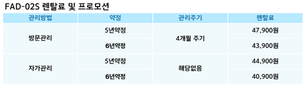 FAD-02S 코웨이 [코웨이] 사계절 의류청정기 더블케어 화이트 제품분류 스타일러 AS기간 렌탈기간내 최저 렌탈가 월 40,900 (렌탈가) 제휴카드 할인가 월 (렌탈가) 5년 6년 자가관리 방문관리 할인 제휴카드 보기 렌탈신청 장바구니