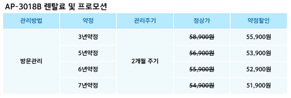 AP-3018B 코웨이 [코웨이] 콰트로파워 공기청정기 30평형 제품분류 청정기 AS기간 렌탈기간내 최저 렌탈가 월 51,900 (렌탈가) 제휴카드 할인가 월 (렌탈가) 3년 5년 6년 7년 방문관리/2개월 할인 제휴카드 보기 렌탈신청 장바구니