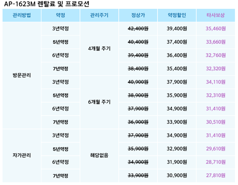 AP-1623M 코웨이 [코웨이] 노블 공기청정기2 16평형 제품분류 청정기 AS기간 렌탈기간내 최저 렌탈가 월 30,900 (렌탈가) 제휴카드 할인가 월 (렌탈가) 3년 5년 6년 7년 자가관리 방문관리/6개월 방문관리/4개월 제품색상 선택 포슬린화이트 + 0원 샌드베이지 + 0원 가든그레이 + 0원 임페리얼브라운 + 0원 페블그레이 + 0원 할인 제휴카드 보기 렌탈신청 장바구니