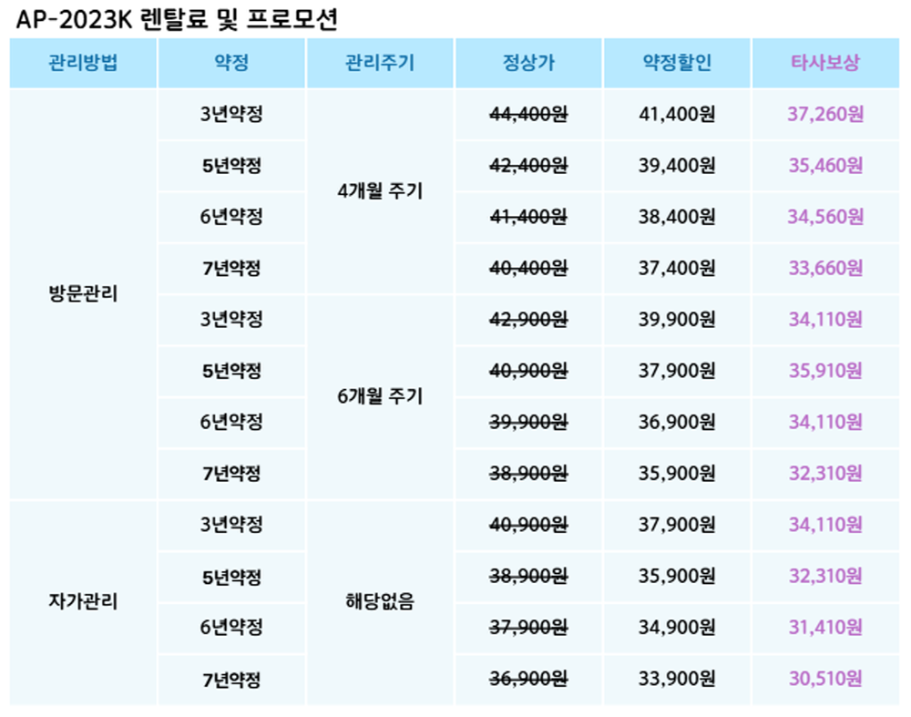 AP-2023K 코웨이 [코웨이] 노블 공기청정기2 20평형 제품분류 청정기 AS기간 렌탈기간내 최저 렌탈가 월 33,900 (렌탈가) 제휴카드 할인가 월 (렌탈가) 3년 5년 6년 7년 자가관리 방문관리/6개월 방문관리/4개월 제품색상 선택 포슬린화이트 + 0원 샌드베이지 + 0원 가든그레이 + 0원 임페리얼브라운 + 0원 페블그레이 + 0원 할인 제휴카드 보기 렌탈신청 장바구니