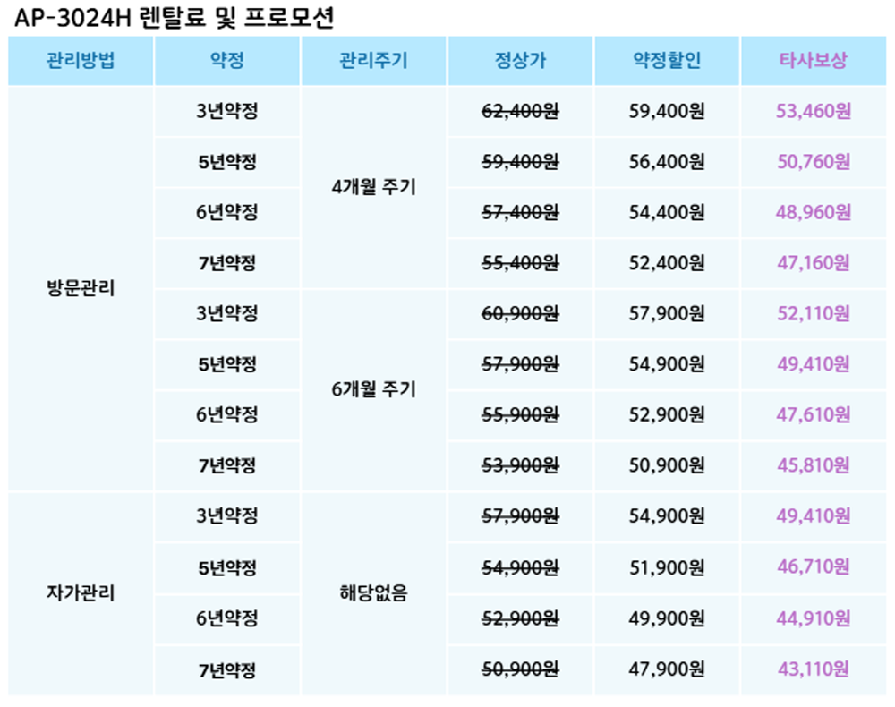 AP-3024H 코웨이 [코웨이] 노블 공기청정기2 30평형 제품분류 청정기 AS기간 렌탈기간내 최저 렌탈가 월 47,900 (렌탈가) 제휴카드 할인가 월 (렌탈가) 3년 5년 6년 7년 자가관리 방문관리/6개월 방문관리/4개월 제품색상 선택 포슬린화이트 + 0원 샌드베이지 + 0원 가든그레이 + 0원 임페리얼브라운 + 0원 페블그레이 + 0원 할인 제휴카드 보기 렌탈신청 장바구니