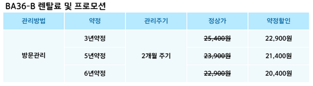 BA36-B 코웨이 [코웨이] 프라임 비데 제품분류 비데 AS기간 렌탈기간내 최저 렌탈가 월 20,400 (렌탈가) 제휴카드 할인가 월 (렌탈가) 3년 5년 6년 방문관리/2개월 할인 제휴카드 보기 렌탈신청 장바구니