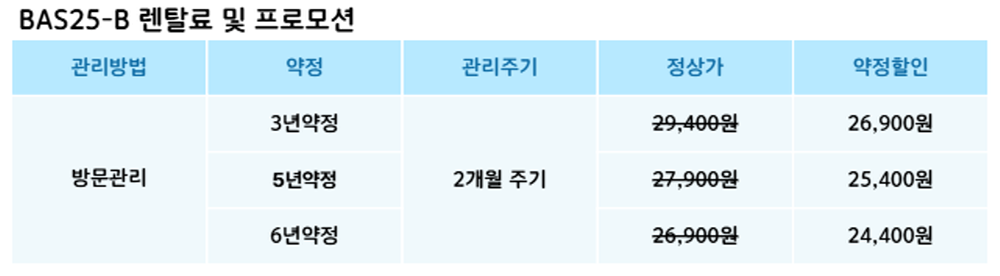 BAS25-B 코웨이 [코웨이] 스스로케어 비데 리모트 제품분류 비데 AS기간 렌탈기간내 최저 렌탈가 월 24,400 (렌탈가) 제휴카드 할인가 월 (렌탈가) 3년 5년 6년 방문관리/2개월 할인 제휴카드 보기 렌탈신청 장바구니