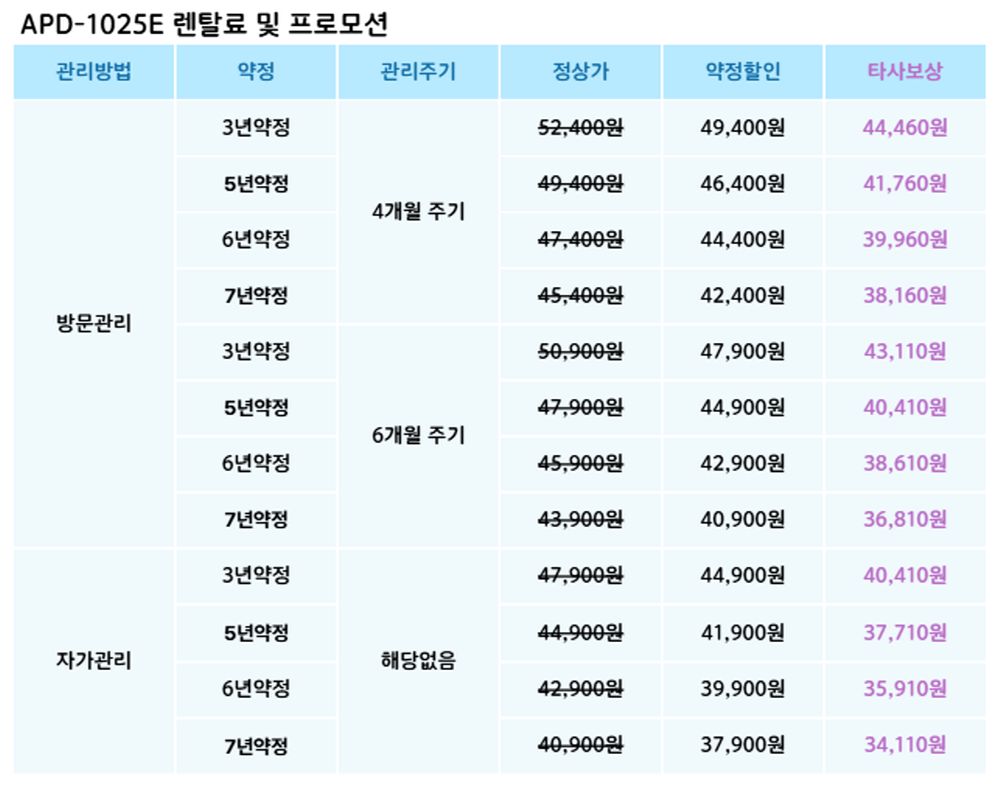 APD-1025E 코웨이 [코웨이] 노블 제습공기청정기 제품분류 제습기 AS기간 렌탈기간내 최저 렌탈가 월 37,900 (렌탈가) 제휴카드 할인가 월 (렌탈가) 3년 5년 6년 7년 자가관리 방문관리/6개월 방문관리/4개월 제품색상 선택 샌드베이지 + 0원 페블그레이 + 0원 포슬린화이트 + 0원 할인 제휴카드 보기 렌탈신청 장바구니