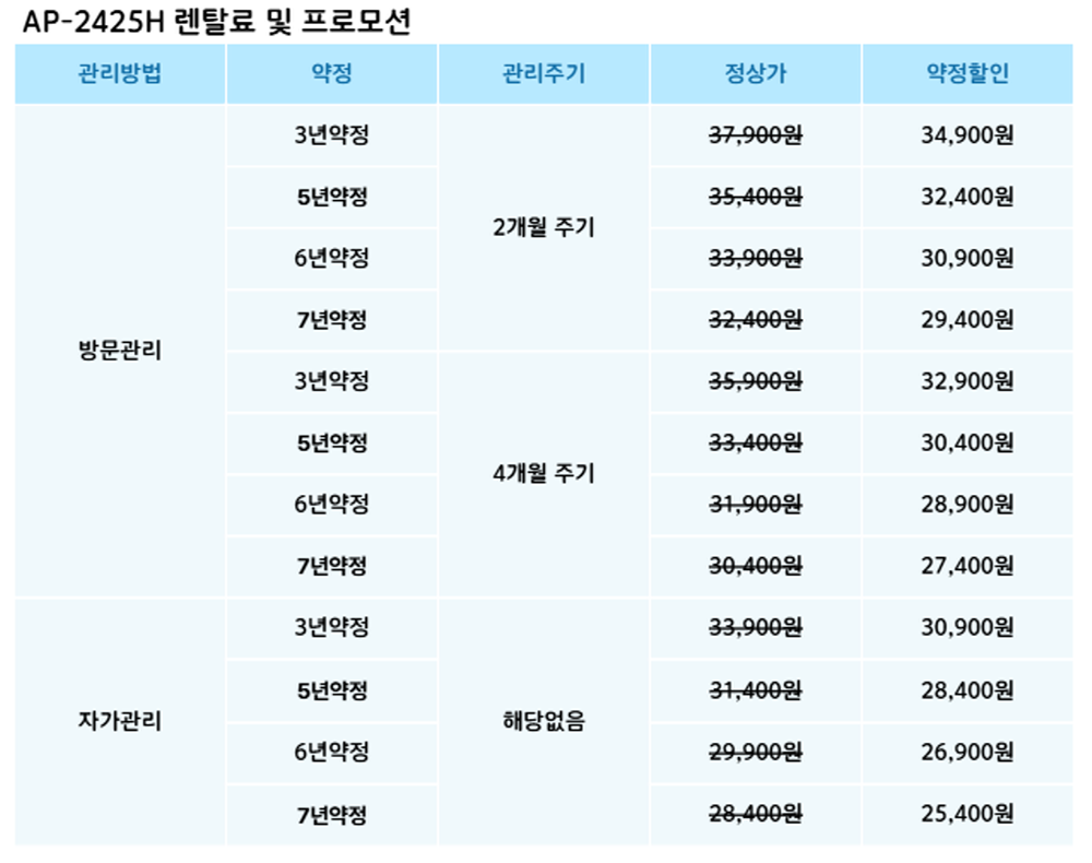 AP-2425H 코웨이 [코웨이] 스퀘어핏 공기청정기 24평형 제품분류 청정기 AS기간 렌탈기간내 최저 렌탈가 월 25,400 (렌탈가) 제휴카드 할인가 월 (렌탈가) 3년 5년 6년 7년 자가관리 방문관리/4개월 방문관리/2개월 제품색상 선택 샌드베이지 + 0원 페블그레이 + 0원 세이지그린 + 0원 퓨어화이트 + 0원 할인 제휴카드 보기 렌탈신청 장바구니