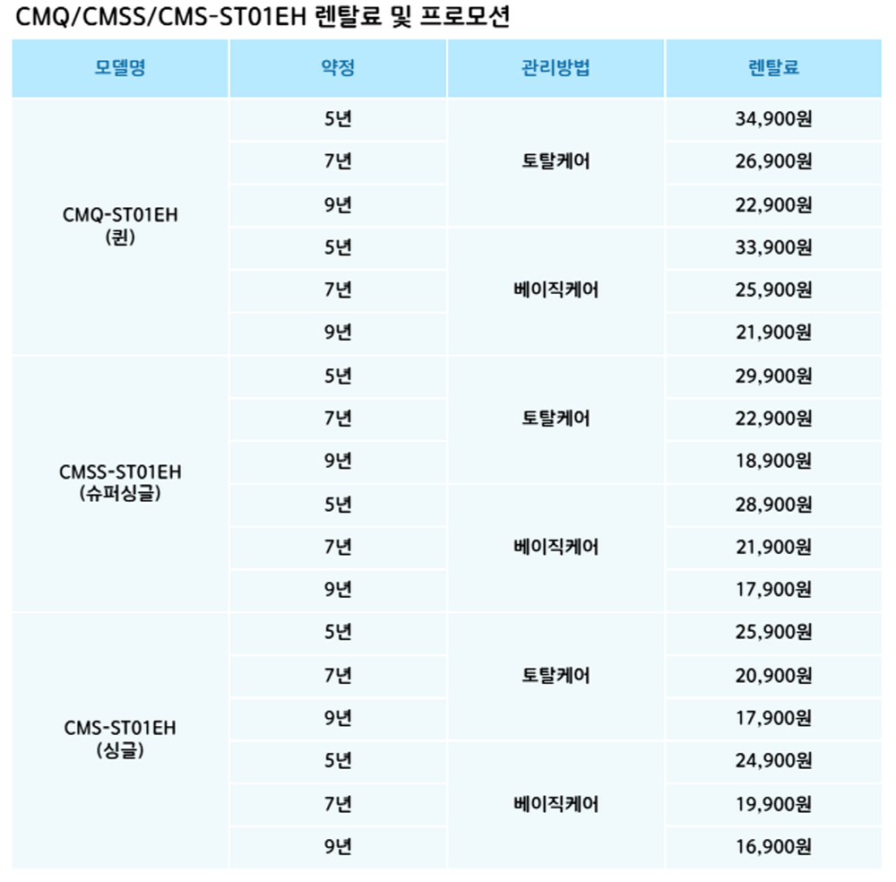 CMSS-ST01EH,CMS-ST01EH,CMQ-ST01EH 코웨이 [코웨이] 엘리트 매트리스 (싱글,슈퍼싱글,퀸) 제품분류 매트리스 AS기간 렌탈기간내 최저 렌탈가 월 16,900 (렌탈가) 제휴카드 할인가 월 (렌탈가) 5년 7년 9년 싱글 슈퍼싱글 퀸 베이직케어 토탈케어 할인 제휴카드 보기 렌탈신청 장바구니