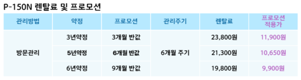 P-150N 코웨이 [코웨이] 빌트인 정수기(일반) 제품분류 정수기 정수방식 직수형 기능 정수전용 AS기간 렌탈기간내 최저 렌탈가 월 19,800 (렌탈가) 제휴카드 할인가 월 (렌탈가) 3년 5년 6년 방문관리/6개월 제품색상 선택 화이트 + 0원 할인 제휴카드 보기 렌탈신청 장바구니